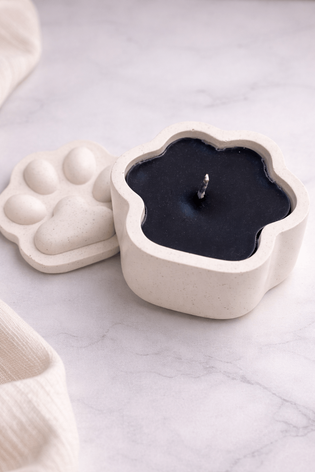 Cada envase de concreto ha sido diseñado y fabricado por nosotros en Luvelia Studio. El cemento aporta una estética industrial y cálida que contrasta perfectamente con la suavidad de la cera en forma de huella.