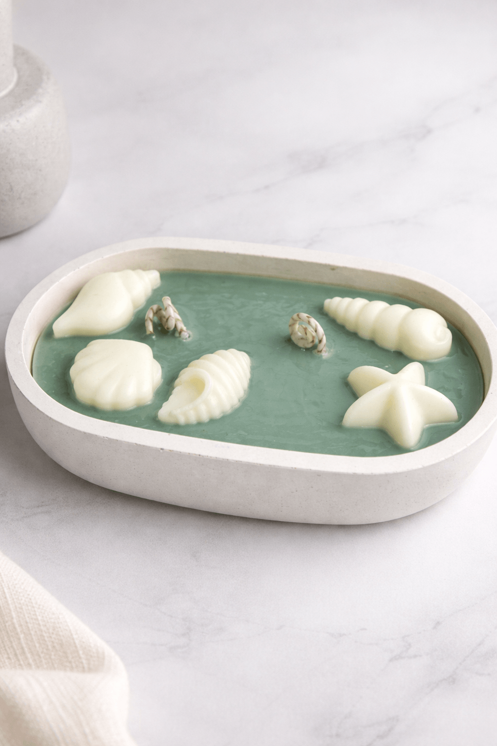 Nuestra pieza Oasis Marino es más que una vela, es una experiencia visual. Una bandeja ovalada de concreto artesanal que alberga una composición de mini conchas y una estrella de mar sobre cera aguamarina, contando una historia del océano en tu hogar.